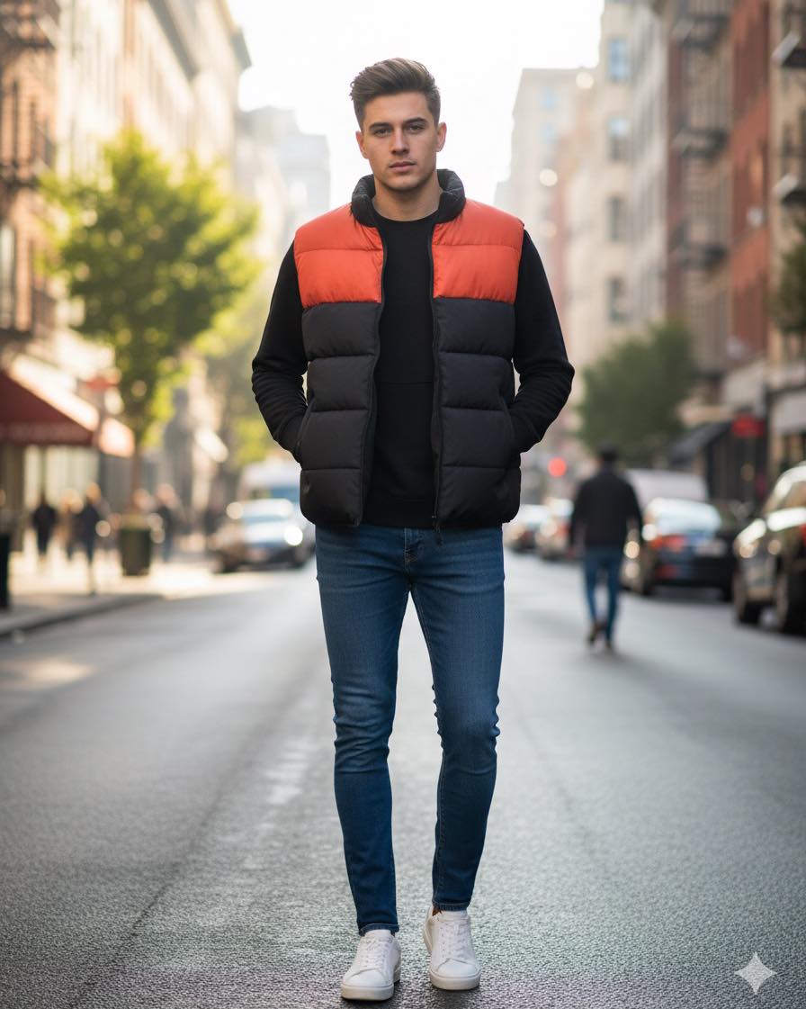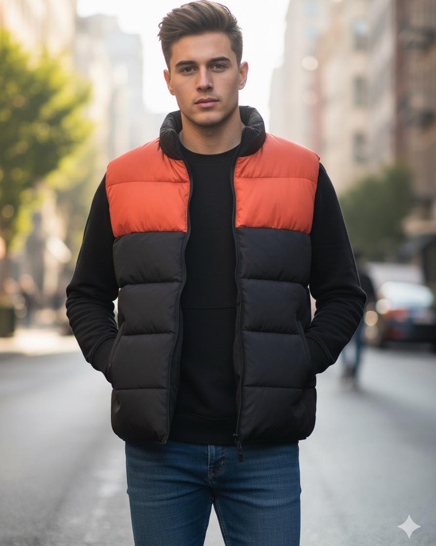 Αυτό το ανδρικό αμάνικο μπουφάν είναι μια εξαιρετική επιλογή για τους πελάτες που αναζητούν ένα κομμάτι με έντονο στυλ, μοντέρνα αισθητική και λειτουργικότητα. Ο τολμηρός δίχρωμος συνδυασμός το καθιστά ένα statement κομμάτι!