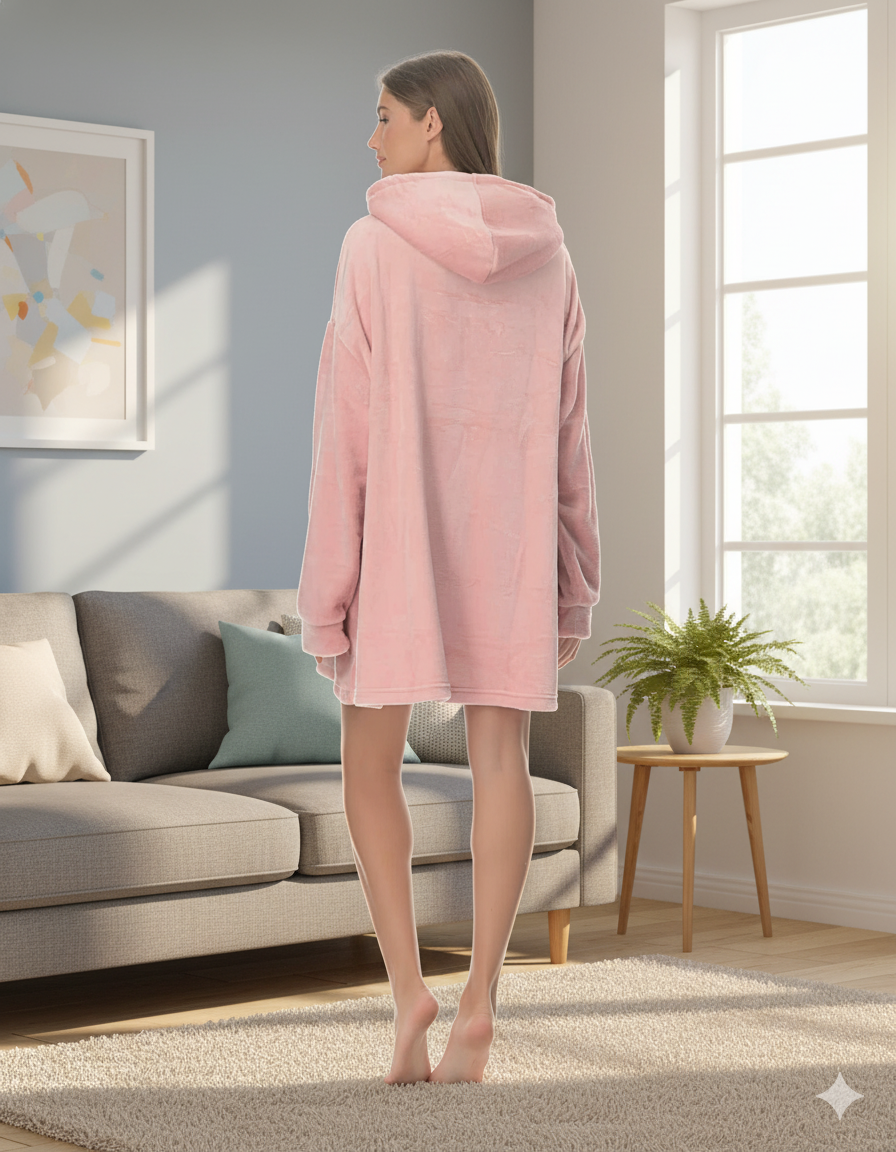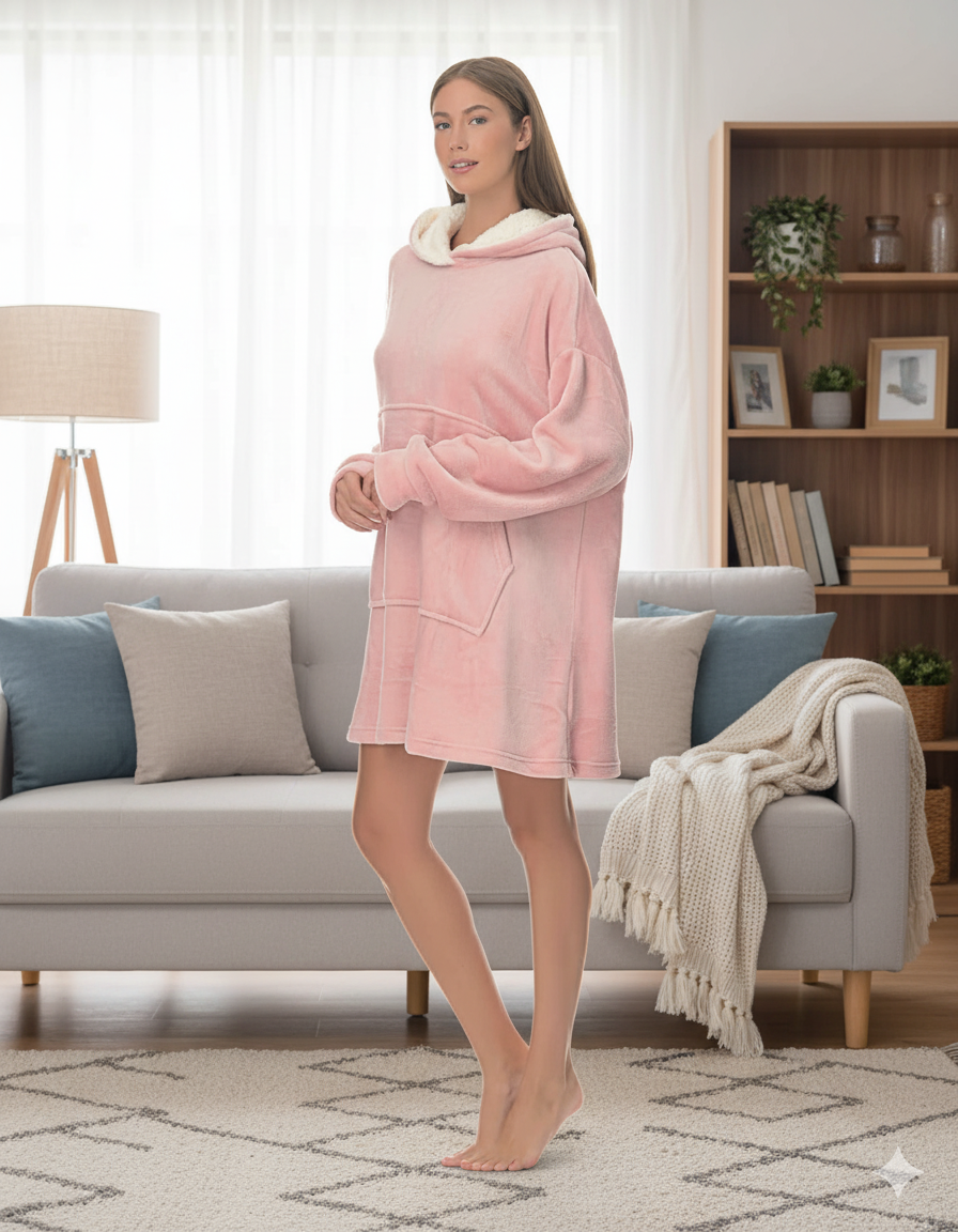 Αυτή η άνετη κουβέρτα-φούτερ είναι ιδανική για να παραμένετε ζεστοί και άνετοι στο σπίτι! Είναι κατασκευασμένη από εξαιρετικά μαλακό, βελούδινο ύφασμα και διαθέτει μια φαρδιά κουκούλα με επένδυση Sherpa και μια ευρύχωρη μπροστινή τσέπη για να κρατάτε τα χέρια σας ζεστά ή να αποθηκεύετε σνακ. Το υπερμεγέθες σχέδιο εξασφαλίζει πλήρη κάλυψη, ενώ η απαλή ροζ απόχρωση προσθέτει μια νότα χαλάρωσης. Ιδανικό για να χαλαρώσετε στον καναπέ, να διαβάσετε ένα βιβλίο ή να απολαύσετε μια ταινία.