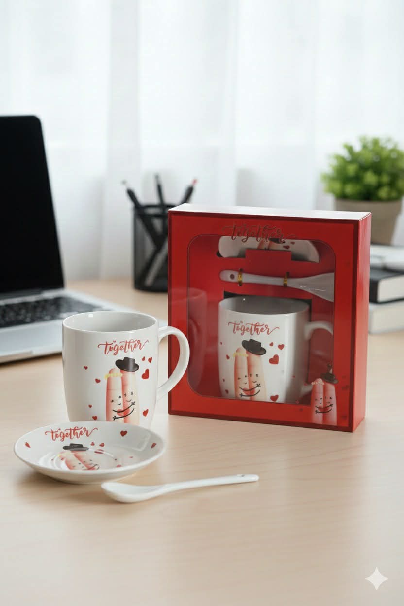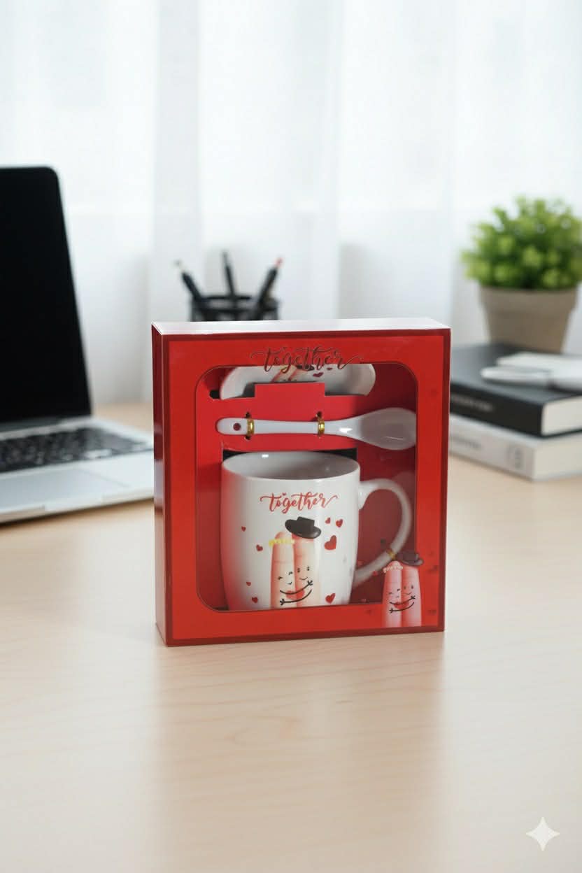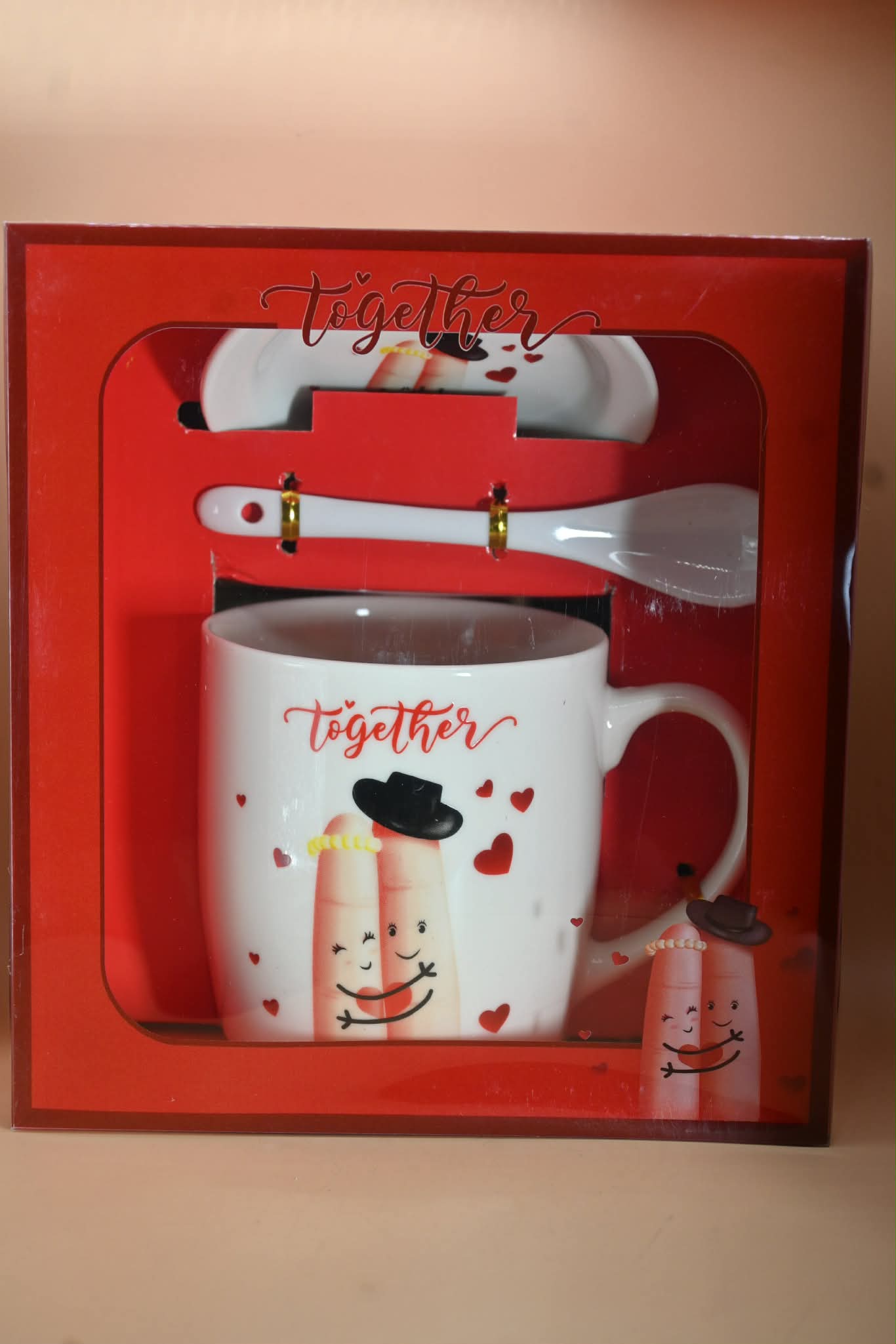 Ανακαλύψτε την πιο cute πλευρά του ρομαντισμού με αυτό το ολοκληρωμένο σετ δώρου 3 τεμαχίων. Η κούπα, κατασκευασμένη από λευκό κεραμικό, διαθέτει μια πρωτότυπη και χιουμοριστική εικονογράφηση: δύο δάχτυλα που έχουν μεταμορφωθεί σε χαρακτήρες (το ένα με καπέλο και το άλλο με πέρλες) και μοιράζονται μια τρυφερή αγκαλιά κάτω από τη λέξη “Together”.