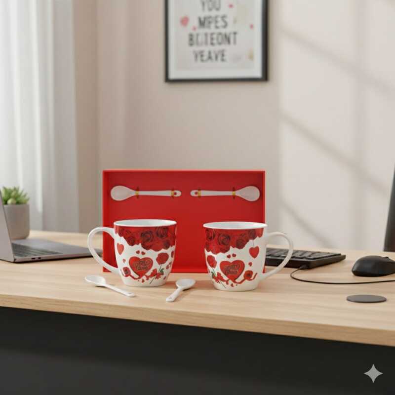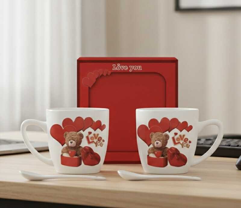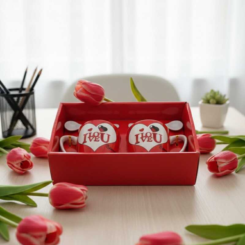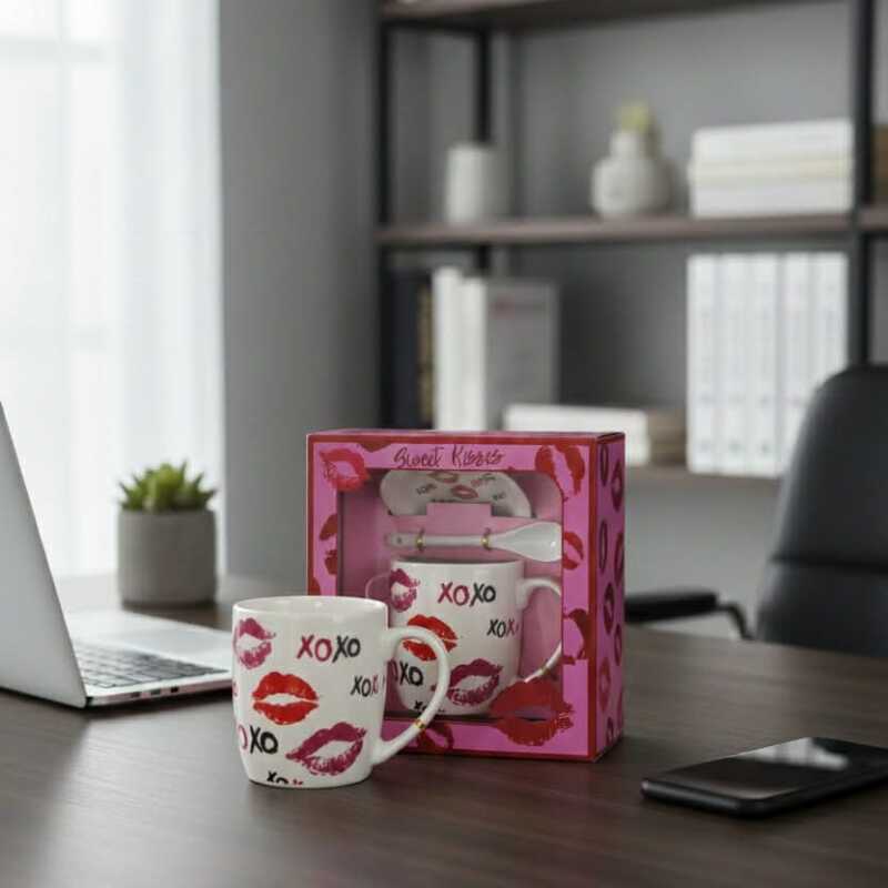 Το σετ συμπληρώνεται από ένα ασορτί πιατάκι που συνεχίζει το ίδιο μοτίβο και ένα φινετσάτο λευκό κουταλάκι με χρυσή λεπτομέρεια. Η παρουσίασή του είναι εξίσου φροντισμένη, καθώς έρχεται σε ένα έντονο κόκκινο κουτί δώρου με παράθυρο, έτοιμο να κλέψει την καρδιά του παραλήπτη.