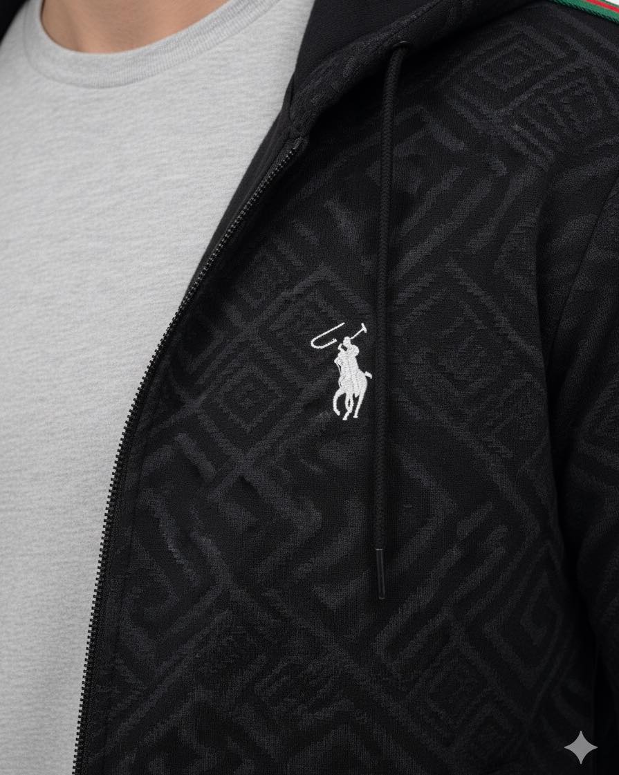 Φούτερ με Κουκούλα: Σε βαθύ μαύρο χρώμα, το φούτερ διαθέτει ένα διακριτικό αλλά εντυπωσιακό ανάγλυφο μοτίβο (πιθανόν γεωμετρικό ή κάποιο λογότυπο) σε όλη την επιφάνεια, προσδίδοντας υφή και βάθος. Ένα κεντημένο λογότυπο αλόγου ή άλλο διακριτικό σύμβολο στο στήθος σε λευκό χρώμα υπογραμμίζει την ποιότητα. Οι χαρακτηριστικές πράσινες και κόκκινες ρίγες κατά μήκος των μανικιών ή στους ώμους προσδίδουν μια κλασική, πολυτελή πινελιά, θυμίζοντας εμβληματικά σχέδια μόδας. Το φερμουάρ προσφέρει ευκολία στην εφαρμογή και η κουκούλα ολοκληρώνει το μοντέρνο look.