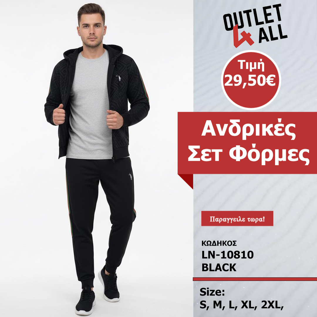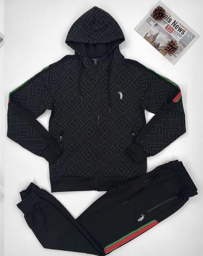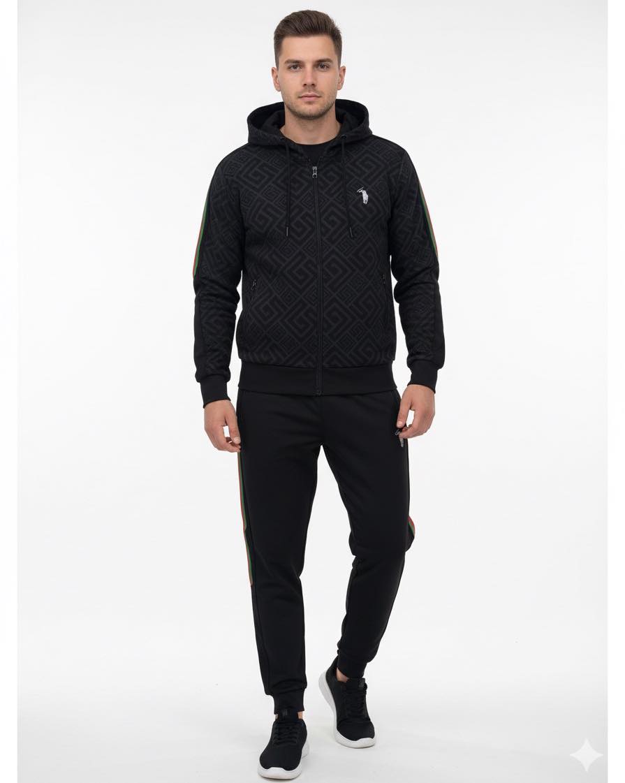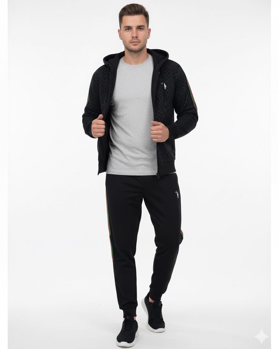 Αυτό το ανδρικό σετ φόρμας αναδεικνύει την κλασική κομψότητα του μαύρου χρώματος, εμπλουτισμένη με διακριτικά αλλά πολυτελή μοτίβα και ζωηρές πράσινες/κόκκινες λεπτομέρειες, προσφέροντας ένα σύνολο που συνδυάζει άνεση, στυλ και μια δόση εκλεπτυσμένης φινέτσας. Είναι ιδανικό για τον άνδρα που επιθυμεί να ξεχωρίζει με ένα δυναμικό και στυλάτο look, είτε σε χαλαρές εξόδους είτε σε πιο casual εμφανίσεις.
